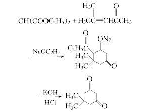 Slowly add diethyl malonate to the ethanol solution of sodium alkoxide at room temperature and stir evenly, then slowly add isopropyl acetone while cooling with water. , then heated to 50°C and maintained for 2 hours. Most of the ethanol was evaporated under reduced pressure, cooled, and filtered. The filtered solid was dissolved in 15% potassium hydroxide.Solution, constant temperature 60℃, stir the reaction thoroughly to obtain 5,5-dimethyl-1,3-cyclohexanedione. The obtained crude product can be adjusted to pH=4.5 with 4mol/L dilute hydrochloric acid at 30℃, and filtered to dryness. Recrystallize in ethanol and purify.