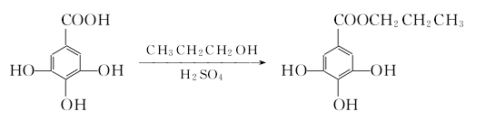 In a flask with a water separation device, add 0.1 mol gallic acid, 0.3 mol propanol, 20 mL benzene or 60-80°C petroleum ether and 0.01-0.04 mol p-toluenesulfonic acid , heat and reflux until no obvious water comes out; put the reaction mixture (light purple-red) under normal pressure and then evaporate the excess propanol and water-carrying agent under reduced pressure; with constant stirring, pour the remainder into cold water while it is hot After suction filtration, it was washed with dilute alkali solution and water until neutral, then decolorized, recrystallized with water, and dried at 80°C to obtain white needle-shaped crystals with a melting point of 147~148°C, with a yield of 87.2%~89.5%.