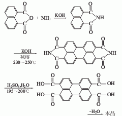 Tetracarboxylimide is obtained by alkali fusion from 1,8-naphthalimide, and then deamination is performed with concentrated sulfuric acid to remove water to form anhydride. Raw material consumption quota: 1,8-naphthalene anhydride (raw material for preparing 1,8-naphthalene imide) 2120kg/t, potassium hydroxide (96%) 6000kg/t, concentrated sulfuric acid 20000kg/t.