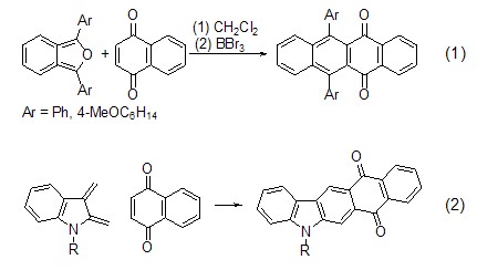 Due to the electron-withdrawing effect of the two carbonyl groups at the 1-position and 4-position, 1,4-naphthoquinone is a very effective dienophile and can react with electronegative diene compounds. -Alder cycloaddition reaction to obtain benzo polycyclic compounds. Such as the cycloaddition reaction with benzofuran to prepare tetracenequinone (formula 1)[1], or the reaction with 2,3-vinyl indole to prepare pentacene (formula 2)[2].