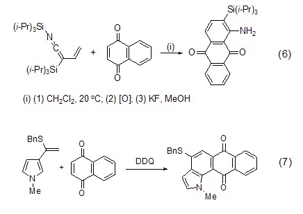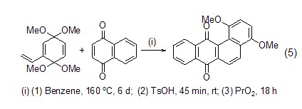 In the synthesis of biologically active compounds On the other hand, 1,4-naphthoquinone also plays a very important role. For example, the reaction with pyrrole provides a good precursor for the preparation of antibiotics (Formula 4)[4], and the Diels-Alder reaction with vinylquinone acetal is used to synthesize non-linear benzopolycyclic rings. Antibiotics provide a good method (Formula 5)[5].