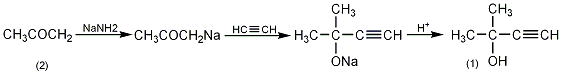 In a reaction bottle equipped with a stirrer, dropping funnel, reflux condenser (ammonia drying tube), and ventilation tube, add 1L of anhydrous ether and 156g (4mol) of very finely ground sodium amide, and cool in an ice-salt bath Slowly add 232g (4mol) of anhydrous acetone (2) dropwise, and complete the addition in about 3 hours. Cool to -10°C and slowly introduce acetylene gas flow for 2 hours to drive out ammonia. Put one end of the air inlet pipe deep into the bottom of the bottle, and connect the other end to the acetylene gas cylinder. The stopper is tied tightly with a metal wire. Cool it in an ice-salt bath and place the entire device on a vibrator. Shake vigorously and react for 10 hours (maintaining an acetylene pressure of 0.7MPa). Down). Open the piston to relieve pressure every 30 minutes to remove ammonia. After the reaction is completed, slowly pour the reactant into 800g of crushed ice, and add 400 mL of 20 mol/L sulfuric acid for acidification while cooling. The organic layer was separated, and the aqueous layer was extracted twice with diethyl ether. The ether layers were combined and dried over anhydrous potassium carbonate. Filter, recover the solvent and then fractionate, collect the fraction at 103-107°C to obtain 135-155g of colorless liquid compound (1), with a yield of 46%. [1]