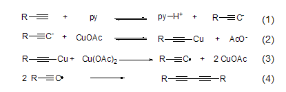 Copper acetate has oxidative activity towards carbanions, and can realize the oxidative coupling reaction of terminal alkynes in the presence of pyridine to obtain diyne compounds (Formula 1~Formula 4)[2] .