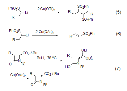 Using trifluoromethanesulfonic acid Using copper as an oxidizing agent can realize the self-coupling reaction of α-sulfonyl lithium carbon anion (Formula 5), but using copper acetate as an oxidizing agent can oxidize it to α,β-unsaturated sulfone compound (formula 6)[3]. Other carbanions can also undergo coupling reactions under the action of copper acetate, such as the synthesis of β-lactam (Formula 7)[4].