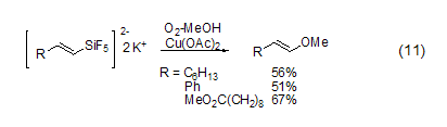 Copper acetate can also achieve carbon- Oxidation reaction of metallic bonds. In an atmosphere of methanol and oxygen, a catalytic amount of copper acetate can promote the cleavage of the vinyl Si-C bond to obtain a vinyl ether compound (formula 11) [8]. The reaction has a high degree of stereoselectivity. Trans-enol ether is completely obtained. The corresponding aldehydes can also be obtained in the presence of water.