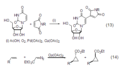 Copper acetate can also be used as a palladium reagent The oxidant in the catalytic reaction re-oxidizes the reduced palladium reagent into Pd(II), and then re-enters the catalytic cycle (Formula 13)[10]. In addition, the combination of copper acetate and chiral imine ligands can induce the asymmetric cyclopropylation reaction of alkenes and diazoacetates (Equation 14)[11].
