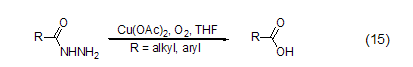 Copper acetate can react with nitrogen-containing compounds Effectively coordinated, it can participate in the reaction of nitrogen-containing compounds as a Lewis acid. For example, a catalytic amount of copper acetate can convert hydrazide to carboxylic acid in the presence of oxygen (Equation 15)[12].