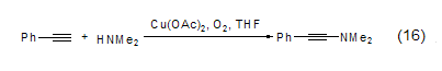 Copper acetate also reacts in the presence of oxygen It can catalyze the coupling reaction of phenylacetylene and dimethylamine to obtain N,N-dimethyl-2-phenylacetylene amine compound (formula 16)[13]. Oxygen is a key factor in this reaction, and in the absence of oxygen, 1,4-diphenylbutyne is the only coupling product.