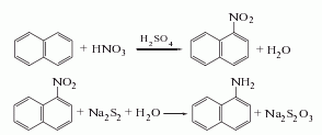 1. Obtained from the reduction of 1-nitronaphthalene (see C10H7NO2, [86-57-7]). Raw material consumption (kg/t) Refined naphthalene 1116 Nitric acid (96%) 561 Sulfuric acid (92.5%) 312 Alkali sulfide (60%) 703 Sulfur (99%) 211