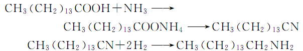 In industrial production, hexadeconitrile can be prepared from palmitic acid and ammonia, and then catalytic hydrogenation under pressure can be produced. Hydrogenation uses Co or Ni as catalyst, the temperature is 120~180℃, and the pressure is 2~10mPa. The reaction formula is: