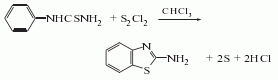 Obtained from the reaction of phenylthiourea and sulfur chloride. First, suck anhydrous chloroform into a glass-lined pot, add phenylthiourea while stirring, slowly raise the temperature to 60-63°C, steam out the aqueous chloroform, cool to 40°C, add sulfur chloride, and keep the gas phase temperature not higher than 40°C. , to prevent the material from clumping. 4 hours after the addition, the temperature was gradually raised to 61°C, and the reaction was refluxed at 61-64°C for 10 hours. Then drain it into a distillation pot containing a certain amount of water and activated carbon, and use direct steam distillation to recover chloroform until the liquid phase temperature is 98°C and maintain it for 15 minutes. After recovery is completed, add water to dilute, add ice to cool, add liquid alkali to neutralize to pH 4.1, add activated carbon and stir. Cool and suction filtrate, neutralize the filtrate with 30% liquid alkali to a pH value of 7.0-7.6, then cool to 35-40°C, press filter and dry (temperature does not exceed 80°C) to obtain the finished product. The melting point is 128-130°C, and the yield is 74.4%.