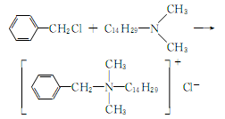 This product can be prepared by the reaction, but due to domestic The raw material of tetradecanol often contains a certain amount of dodecanol, so the tetradecyldimethyltertiary amine produced by the new catalytic ammoniation process of tetradecyl alcohol and dimethylamine also often contains a certain amount of dodecanol. Alkyl dimethyl tertiary amine, so the product often contains a certain amount of dodecyl dimethyl benzyl ammonium chloride. Take 241 parts of tetradecyldimethyl tertiary amine, add 126.5 parts of benzyl chloride at a temperature not exceeding 100-110°C, and heat at 120°C for 2 hours to obtain a light yellow viscous liquid, which is cooled into a solid. The yield is 90%. above. The reaction formula is as follows: