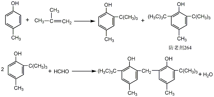 Under the catalysis of 732# strong acidic ion exchange resin, p-cresol undergoes alkylation reaction with isobutylene at about 60°C. After the reaction is completed, the catalyst is filtered off, and the filtrate is added to a methanol-caustic soda solution to precipitate antioxidant 264. After filtration, the anti-aging agent 264 is recrystallized in alcohol, then filtered and dried to obtain the anti-aging agent 264 as a by-product. The filtrate after filtering out the antioxidant 264 is subjected to neutralization, distillation (methanol recovery), water washing, vacuum distillation, crystallization and filtration to obtain the intermediate product 2-tert-butyl-4-cresol. Use 200# gasoline as a solvent and formaldehyde in a sulfuric acid medium to conduct a condensation reaction at 90-95°C. The reaction product is neutralized, filtered, washed, dried, powdered, and packaged to obtain the finished product.