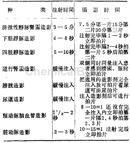 Due to different clinical requirements and purposes, the injection time and projection time of various types of angiography are also different, and errors are often caused by improper control of injection time and photography time. The injection time and photography time of various angiography are now listed in the table: