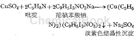 Simple titration analysis method of X-ray contrast agent sodium acetoiodate. Since pyridine can form a complex [Cu(CSH6N)2]2+ with CuSO4 in a relatively dilute aqueous solution, this complex forms a lavender crystalline precipitate with pyridine, and its composition is: Cu:I=1:2 (sodium acetate can promote the precipitation of this precipitate). According to this, the excess CuSO4 is titrated with EDTA-ZNa, and the content of I can be calculated from the number of milliliters consumed in the reaction between the CuSO4 solution and I. The reaction is as follows: