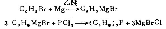 Under a dry atmosphere, prepare the Grignard reagent using 34.1 g (0.22 mol) of olfactory benzene, 5.2 g (0.21 g atom) of magnesium and 108 ml of anhydrous ether. The resulting phenyl bromide Store the magnesium under an inert gas, stir and cool with an ice bath, slowly add (15 to 20 minutes) 6.0 g (0.044 mol) phosphorus trichloride and 35 ml of diethyl ether solution. Use 11 ml of concentrated hydrochloric acid and 30 ml of water. The mixture was slowly treated with the solution. The ether layer was separated, and the water layer was extracted with ether. After the ether solutions were combined, distill under normal pressure hydrogen until the temperature of the residue in the distillation vessel reached 285°C. The residue was recrystallized with ethanol. times, 8.7 grams (76%) of white triphenyl was obtained, with a melting point of 79.5°C.
