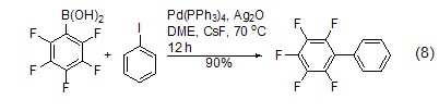 As a metal catalyst Ligand It serves as a ligand to form a metal catalyst with many transition metals, such as Pd(PPh3)4, which is an important catalyst[8 ], often used in catalytic coupling reactions, is an important method to construct carbon-carbon bonds, and is characterized by mild catalytic conditions. For example, in Pd(PPh3)4 and Ag2O, phenylboronic acid reacts directly with aromatic halogenated hydrocarbons to form biphenyl compounds. The yield of this reaction reaches 90% (Equation 8 )[9,10]. In addition to phenylboronic acid and halogenated compounds, magnesium reagents [11], zinc reagents [12], tin reagents [13], silicon compounds [14], etc. can be used as substrates for coupling reactions.