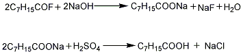 In the electrolytic cell of the electrode group consisting of alternating nickel anodes and iron cathodes, add anhydrous liquid hydrogen fluoride, octanoyl chloride and a small amount of n-butylmercaptan. After mixing evenly, apply 2500A direct current. In order to maintain the concentration of the electrolyte during the electrolysis process, octanoyl chloride needs to be continuously added. The electrolytic products are insoluble in the electrolyte and sink to the bottom of the electrolytic tank, and need to be released after a certain period of time. The electrolyte temperature is controlled at 24°C. The voltage is controlled between 5 and 8V for electrolysis operation. The gas generated during the electrolysis process is cooled and condensed by the condenser to below -30°C, and then pressurized by the buffer and water to maintain the system at a pressure of 0.042MPa, and then the gas is vented. The electrolyzed product is neutralized with sodium hydroxide and acidified with sulfuric acid, and then sent to the distillation tower for distillation. The fraction with 1.33kPa and 91.5~93.5℃ is collected as the finished product.