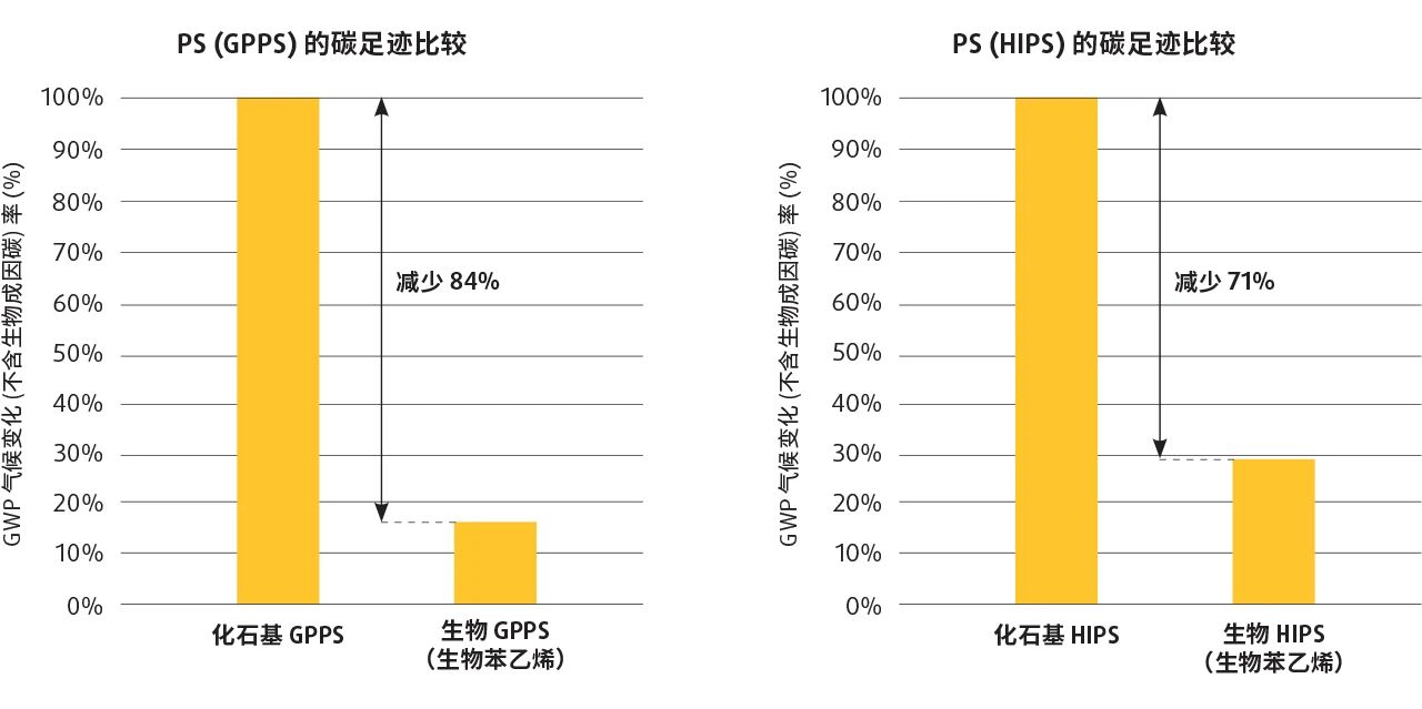GPPS, both products use styrene monomer replacement materials. The product carbon footprint (PCF) of both products is reduced by 71% and 84% respectively compared to baseline fossil-based materials.