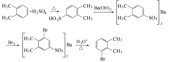 Add 106g (1mol) of o-xylene and 107mL (1.97mol) of 98% o-xylene into a 3L four-neck bottle equipped with stirring, reflux tube and thermometer. Concentrated sulfuric acid, then stirred and heated at 100°C for 1.5h, then cooled to room temperature. After adding 1500 mL of water and stirring to dissolve, neutralize to pH 7 with an alkali solution of 473 g of hydrated barium hydroxide and 750 mL of water while stirring. Filter while hot, pour the filtrate into a 3L three-necked bottle, add 192g (1.2mol) of bromine, 200g of barium bromide, and 700mL of water at 50~60℃ while stirring, and stir at 50~60℃.�Reaction 15h. Then cool, filter, wash with 200mL×2 water, and dry in vacuum to obtain about 231g of 3-bromo-o-xylenesulfonate barium salt, with a yield of 69%.