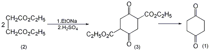 Diethyl 2,5-dioxo-1,4-cyclohexanate (3): In a reaction bottle equipped with a stirrer and a reflux condenser, add 900 mL of absolute ethanol and add in batches 92g (4 mol) of metallic sodium. After adding, heat and reflux to complete the reaction of metallic sodium. After cooling slightly, add 348.4g (2mol) of diethyl succinate at one time (pay attention to prevent overflow), stir and reflux for 24 hours. After recovering ethanol under reduced pressure, add 2000 mL of 2 mol/L sulfuric acid and stir vigorously for 3 to 4 hours. Filter, wash the filter cake with water three times, and dry to obtain 180-190g of crude product, mp 126-128°C. Recrystallize with 1500 mL of ethyl acetate to obtain 160 to 168 g of 2,5-dioxo-1,4-cyclohexanedioic acid diethyl ester (3), mp 126.5 to 128.5°C. The mother liquor is concentrated, and 5.7g can be recovered, with a total yield of 64% to 68%. 1,4-Cyclohexanedione (1): Add 170g (0.66mol) of the above compound (3) and 170mL of water into the pressure reactor, and raise the temperature to 185~195℃ (about 90min). After the heat preservation reaction for 10 to 15 minutes, immediately remove the heat source, quickly cool to room temperature, open the reaction kettle, and pour out the reaction solution to obtain a yellow-orange liquid. Add an equal amount of ethanol, evaporate the solvent under reduced pressure, and then distill under reduced pressure to collect the 130-133°C/2.66kPad fraction (immediately solidified) to obtain 60-66g of 1,4-cyclohexanedione (1), yield 81%~89%. Recrystallize with carbon tetrachloride to obtain pure product. [1]