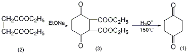 1,4-Cyclohexanedione-2, 3-Dicarboxylic acid ethyl ester (3): In a reaction bottle equipped with a stirrer and a reflux condenser, add 1000 mL of absolute ethanol, and add 92 g (4 mol) of clean metallic sodium in batches. The reaction is exothermic and can be used if necessary. Water bath cooling. After the metallic sodium has completely reacted, add 350g (2mol) of diethyl succinate (2) in batches and reflux for 25 hours under stirring. A large amount of solid precipitated during the reaction. The ethanol is distilled off. Cool and neutralize to weak acidity with 10% dilute sulfuric acid. Crush the lump, suction filter, wash thoroughly with cold water, and dry to obtain 1,4-cyclohexanedione-2,3-dicarboxylic acid ethyl ester (3) 130g, mp126~128 ℃. The yield is 50%. 1,4-Cyclohexanedione (1): In a reaction bottle equipped with a stirrer and a reflux condenser, add 130g (0.508mol) of compound (3), 4L of water, 750g of phosphoric acid, and 100mL of ethanol, and conduct a reflux reaction for 90 hours. Concentrate to half the volume under reduced pressure and extract repeatedly with chloroform. Chloroform was evaporated under reduced pressure to obtain crude product. Distill under reduced pressure, collect the fraction at 125~135℃/2.67kPa, and solidify after cooling to obtain 1,4-cyclohexanedione (1) 29g, mp74~76℃, yield 52% . Note: ① The possible mechanism of this reaction is as follows. ② React 1,4-cyclohexanedione-2,3-dicarboxylic acid ethyl ester (3) with an equal amount of water at 4.5~5.9MPa and 180~185℃. The yield can reach more than 65%. [2]
