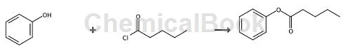Phenyl valerate is prepared as follows: Dissolve substituted phenol (15mmol) in 20ml of 10% aqueous sodium hydroxide (50mmol NAOH) solution in a 100ml flask. A solution of tetra-n-butylammonium chloride (1.5 mmol) in 5 mL of dichloromethane and an acid chloride (15 mmol) in 15 mL of dichloromethane was prepared. After cooling all solutions at 0°C, they were mixed immediately. The reaction mixture was maintained at 0 °C for 5 min with vigorous magnetic stirring (400 rpm) and then poured into 50 mL of ice water. The organic layer was separated, and the aqueous layer was extracted twice with 40 mL of diethyl ether. The combined organic extracts were washed with saturated NaCl solution. After drying over Na2SO4, the solvent is evaporated and the residue is analyzed directly by gas chromatography (GC), liquid chromatography (LC) and/or GC-mass spectrometry (MS). Quantitative determinations were performed using the internal standard method. The product structure was also identified by infrared (IR), NMR spectroscopy and GC-mass analysis. Amyl valerate yield: 84%.