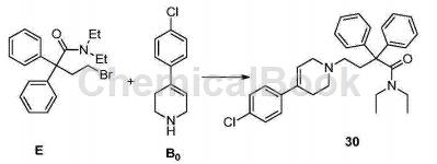 CN201610545435.3 Based on the study of the pathogenesis of MLL leukemia and the targetability of the menin-MLL interaction interface in the treatment of MLL leukemia, through the virtual screening method of skeleton transition and combined with experimental verification at the molecular and cellular levels, it was discovered that Loperamide hydrochloride, a marketed drug originally used for antidiarrhea, and its multiple derivatives have promising applications in the treatment of MLL leukemia. Experiments have shown that loperamide and its derivatives can bind to menin protein, disrupt the menin-MLL interaction system, down-regulate highly expressed HOX series genes, and cause MLL leukemia cells to produce G0/G1 cycle arrest and tend to differentiate and undergo apoptosis. , thereby inhibiting the proliferation of MLL leukemia cells. Compound 30 was prepared from diphenylbromobutyric acid (compound D) using the following method: