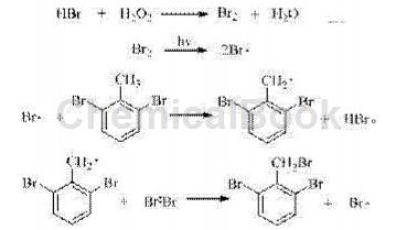 Hydrobromic acid reacts with hydrogen peroxide to produce bromine, and bromine free radicals are generated under light triggering.The methyl hydrogen is taken to generate 2,6-dibromobenzyl radical, which finally reacts with bromine to generate 2,6-dibromobenzyl and bromine radicals, which continue to participate in the next round of radical substitution reactions. The traditional bromine substitution method generates a molecule of bromine product and a molecule of highly corrosive hydrogen bromide, which has low raw material utilization and is not conducive to environmental protection. In the present invention, hydrogen bromide is always in the reaction cycle, which greatly improves the utilization rate of the bromination reagent and reduces the production cost.