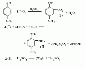 O-nitro-p-cresol is obtained by reduction with alkali sulfide or catalytic hydrogenation. Starting from the nitration of p-cresol, the raw material consumption quota is: p-cresol industrial product 963kg/t, nitric acid (96%) 661kg/t, sulfuric acid (92.5%) 2127kg/t, alkali sulfide (60%) 2425kg/t, soda ash 20kg/ t.