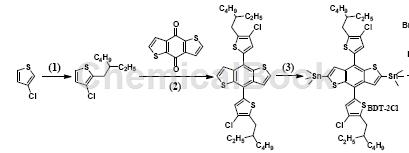 To (4,8-bis(4-chloro-5-(2-ethylhexyl)thiophen-2-yl)benzo[1,2-B4,5-B’]bithiophene-2,6 -Diyl)bistrimethyltin is prepared by adding TT-F, adding Pd(PPh3)4, dissolving in anhydrous toluene/DMF, and reacting at 120°C.