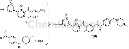Put 1f (1.83g, 0.006mol) into a 100mL three-necked flask, add purified water (31mL), stir to lower the internal temperature to 0~3°C, and add 4-(4-methylpiperazinemethyl)benzene in batches Formyl chloride dihydrochloride (3.9g, 0.015mol), stir at room temperature for 2 hours, filter, add acetone (16mL) to the filtrate, heat to 45-50°C, add ammonia dropwise until the cloud point appears, cool to room temperature, stir and precipitate Crystallize for 2 hours, filter with suction, wash with purified water (10mL×2), and vacuum dry at 75-80°C for 2 hours to obtain 4-[(4-methyl-1-piperazinyl)methyl]- as a yellow solid N-[4-methyl-3-[[4-(1-oxo-3-pyridyl)-3-oxo-2-pyrimidinyl]amino]phenyl]benzamide formula (I) 2.29g, collected The rate is 73%, HPLC: 99.2%.