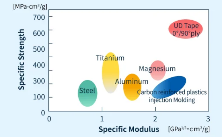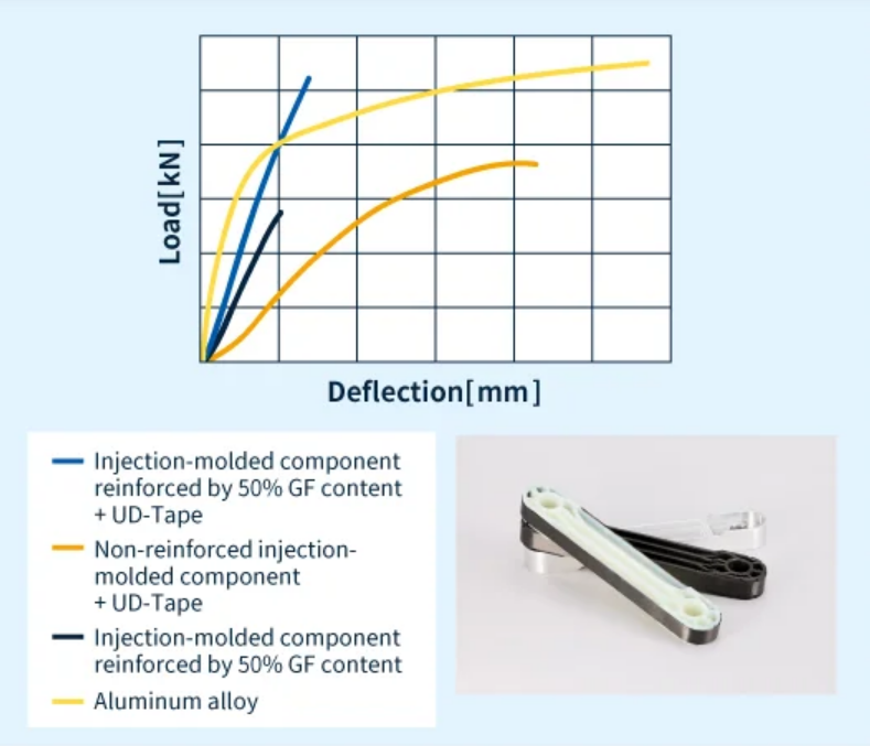 UD-Tape can also be welded to other thermoplastic resin materials and, when combined with the excellent shape flexibility offered by injection molding, can produce multi-material component structures with sufficient strength and stiffness, especially where conventional injection molding cannot produce In the case of components of sufficient strength and rigidity.