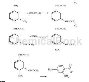 3) In a stirred glass reaction vessel, add 60g of isopropyl alcohol solution, 120g of water and 40g of concentrated water. Heat the sulfuric acid to 70°C and add 43 grams of 4-nitro-m-diacetylanilide. The mixture was heated to 85°C for 4 hours. After 4 hours, the solution was cooled to 50°C and neutralized to pH 6-7 with 27% ammonium hydroxide. After neutralization, stir for another 30 minutes. The mixture was further cooled to less than 25°C, 150 grams of water was added, and after 1 hour, the product was filtered, and the recovered wet cake was dried at less than 80°C. Obtain 23-25 grams of p-nitro-m-phenylenediamine, with a yellow to orange appearance and a melting point higher than 156°C. Relative to 4-nitro-m-diacetylanilide, 83 to 90% of theoretical yields were obtained.