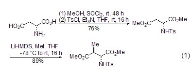 Diastereoselective alkylation L-aspartate ester can be used in α– and β– Alkylation occurs (formula 1) [2], among which the β-alkylation reaction is the most widely used. During the β-alkylation reaction, the amino acid moiety has an important influence on the diastereoselectivity of the reaction. At the same time, β-dicarbonyl compounds can also be prepared through β-alkylation of cyclic derivatives of L-aspartic acid [3].