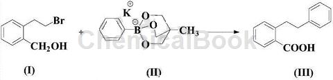 The preparation of 2-phenylethylbenzoic acid is as follows: add 100 mmol of the above formula ( I) compound, 100 mmol of the compound of formula (II) above, 8 mmol of catalyst bis(cyanomethyl)palladium dichloride, 10 mmol of nitrogen multidentate ligand, 180 mmol of oxidant bis(trifluoroacetate)iodobenzene and 200 mmol of organic base dimethylamino Pyridine, raise the temperature to 70°C, and stir the reaction at this temperature for 24 hours. After the reaction is completed, filter while hot, cool the filtrate to room temperature naturally, adjust the pH value to neutral, and then wash it 2-4 times with a sufficient amount of saturated sodium carbonate aqueous solution, combine the organic phases, cool to 2-6°C, and precipitate a solid. Filter with suction, wash thoroughly with absolute ethanol, and dry under vacuum to obtain the compound of formula (III) 2-phenylethylbenzoic acid in the form of white crystals with a yield of 97.2% and HPLC analysis showing that its purity is 98.7%. Melting point: 127.8-128.5℃.