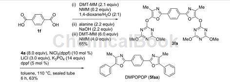 Condition B: Add 5-(triazinyloxy)oxazole 3aa (100mg, 0.318mmol), 4-ethoxycarbonylphenylboronic acid (4b, 246mg, 1.27mmol) to a screw cap tube in N2 , NiCl2 (dppf) (10.9mg, 0.0159mmol), K3PO4 (473mg, 2.23), LiCl (40.4mg, 0.954mmol), DPPF (8.8mg, 0.0159mmol) and toluene (2.3mL). The mixture was stirred at 110°C for 6 hours and the reaction mixture was cooled to room temperature. The reaction mixture was diluted, CH2Cl2 (10 mL) was filtered through a short pad of Celite, and the filtrate was concentrated under reduced pressure. The residue was purified by flash column chromatography (EtOAc:hexane = 10:90) to obtain 1,4-bis[2-(4-methyl-5-phenyloxazole)]benzene 5aab (62.5 mg, 64 %), as a white solid.