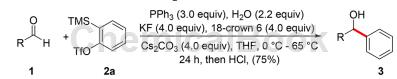 The specific steps are: use a flame-dried screw-capped test tube equipped with a magnetic stirring rod, add phosphine (0.197g, 0.75mmol), KF (0.058g, 1.0mmol) and 18-crown-6 (0.264g, 1.0 Millimoles). The screw cap tube was then evacuated and backfilled with argon. The mixture was dissolved in THF (4.0 mL) under an argon atmosphere at room temperature, and the reaction mixture was cooled to 0 °C and kept stirring for 5 min. Add aromatic hydrocarbon to the stirred solution. Add precursor 2a (1.0 mmol), continue stirring for another 5 min, then add water (0.010 g, 10.0 μL, 0.55 mmol).