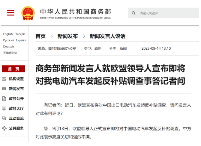 In response to the announcement by EU leaders on September 13 that they would launch a countervailing investigation into electric vehicles imported from China, a spokesman for the Ministry of Commerce responded on September 14 that China is highly concerned and strongly dissatisfied with this. China believes that the investigative measures proposed by the EU are actually to protect its own industry in the name of “fair competition”. It is a naked protectionist act that will seriously disrupt and distort the global automotive industry chain and supply chain, including the EU, and will It will have a negative impact on China-EU economic and trade relations.