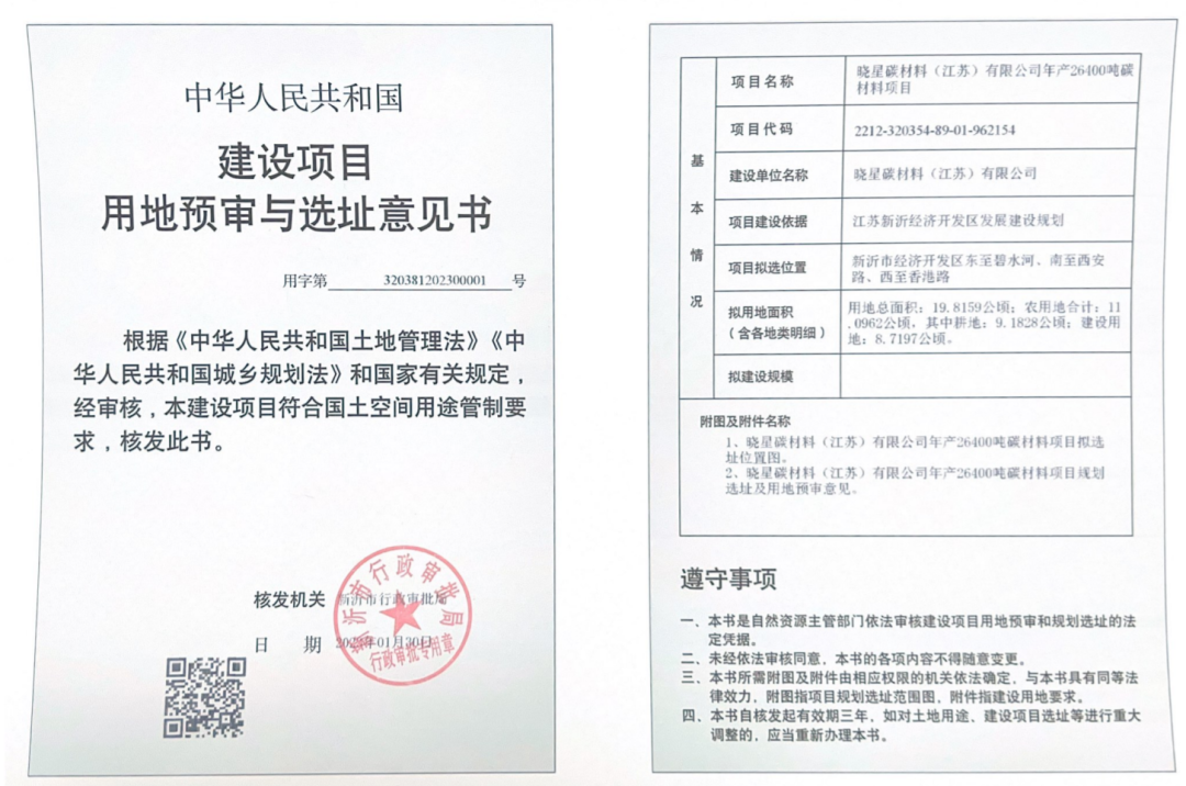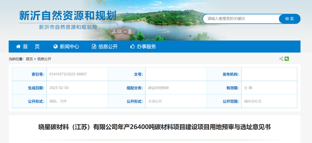On February 3, the Jiangsu Xinyi Natural Resources and Planning Bureau issued the Hyosung Carbon Materials (Jiangsu) Co., Ltd. annual output of 26,400 tons of carbon materials project construction project land pre-examination and site selection opinions.