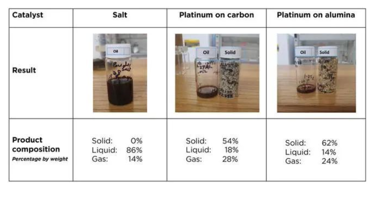 Kumar. When pyrolyzing polyolefins using table salt as a catalyst, much of the liquid oil the team produced contained hydrocarbon molecules similar to those found in diesel fuel, Rabnawaz said. The researchers showed that another advantage of the salt catalyst is that it can be reused.