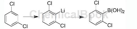1. Preparation of 2,6-dichlorophenylboronic acid. This preparation method uses 1,3-dichlorophenyl ether as raw material. The raw material and lithiation reagent undergo lithium and hydrogen exchange reaction to prepare phenyllithium compound. The resulting benzene The phenylboronic acid ester is obtained by reacting the lithium compound with the boric acid ester; then the boric acid ester is hydrolyzed with dilute hydrochloric acid to obtain crude 2,6-dichlorophenylboronic acid; finally, pure 2,6-dichlorophenylboronic acid is obtained after purification product; this reaction uses tetrahydrofuran as the reaction solvent. The above-mentioned 2,6-dichlorophenylboronic acid preparation method has the advantages of using cheap and easily available raw materials, mild reaction conditions, simple post-processing operations, low production costs, high yields, reduced reaction costs, and is suitable for industrial production.