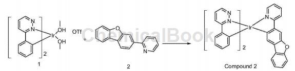 CN201510906440.8 reported that 3-bromodibenzo[B,D]furan can be used to synthesize a phosphorescent iridium complex 2 containing a 3-phenylpyridazine structure. This iridium complex uses metallic iridium as the core and as the phosphorescent doping material of the light-emitting layer. The OLED device can achieve high brightness, high efficiency, and low voltage effects. The reaction is divided into three steps as follows: