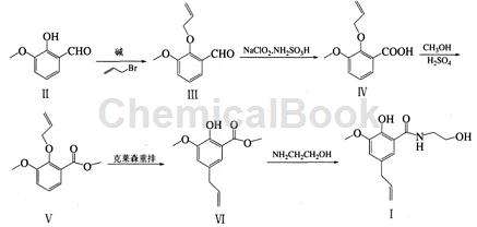 At present, there are few public reports on the synthesis of alipendol. Francoi Clemence et al. mentioned a method for preparing alipendol in their patent: using ethyl 2-hydroxy-3-methoxy benzoate as raw material, first react with ethanolamine to obtain 2-hydroxy-3-methoxy -N-(2-hydroxyethyl) benzamide, and then undergo allylation reaction under alkaline conditions of potassium carbonate to prepare 2-(2-propenyloxy)-3-methoxy-N-(2 -Hydroxyethyl) benzamide, and finally alipendol is obtained through Claisen rearrangement reaction. Although this process route is short, the raw material used, ethyl 2-hydroxy-3-methoxybenzoate, is not a common raw material in the market, and its source has not been disclosed. The yield and product purity of each step of the reaction have not been reported. Eunju Kim et al. reported a synthesis method of alipendol: using 2-hydroxy-3-methoxybenzaldehyde (o-vanillin) as raw material, and trimethyl orthoformate under the catalysis of ion exchange resin Amberlyst15 Acetal is generated, and then oxidized and esterified to 2-hydroxy-3-methoxybenzoic acid methyl ester with m-chloroperbenzoic acid and boron trifluoride/diethyl ether; then, through allylation reaction, Claisen Alibendol is prepared through rearrangement reaction and aminolysis reaction. The advantage of this process is that it uses o-vanillin, which is easily available on the market, as raw material, and uses the “one-pot method” to convert aldehydes into esters. The disadvantage is that the reagent used, m-chloroperbenzoic acid, has poor stability, is inconvenient to transport and store, and causes great pollution. , and separation and processing are relatively difficult; all product purification in this process uses column chromatography separation that is difficult to operate in industrial production. Kompella Amala and others used 2-methoxyphenol as raw material, and obtained 2-methoxy-4-(2-propenyl)phenol after allylation reaction and Claisen rearrangement reaction, and then reacted with CO2 React under acidic conditions to obtain 2-hydroxy-3-methoxy-5-(2-propenyl) benzoic acid. This intermediate is then subjected to esterification and aminolysis to obtain the target product-aribenzoic acid. many. This route involves carbonylation, the reaction conditions are harsh, and the yield is low.