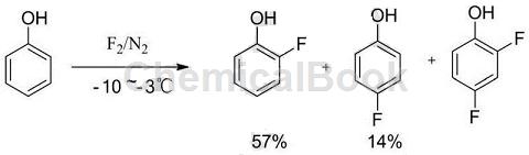 1) Dissolve phenol in an appropriate amount of solvent, cool it to -10~-3°C, and then pass in fluorine gas diluted with nitrogen to react to obtain o-fluorophenol and p-fluorophenol. The ratio is 57:14. This process route not only requires the use of highly dangerous fluorine gas, but also the two isomers of o-fluorophenol and p-fluorophenol in the product are difficult to separate, and tar-like by-products will also be generated. . The synthetic equation is shown in equation: