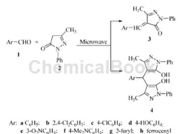 Under solvent-free and catalyst-free conditions, microwave-promoted condensation reaction of 1-phenyl-3-methyl-5-pyrazolone and aromatic aldehyde will yield 4-aryl methylene-3- Methyl-1-phenyl-5-pyrazolone and 4,4′-aryl methylene-bis(1-phenyl-3-methyl-5-pyrazolone) in good yields.