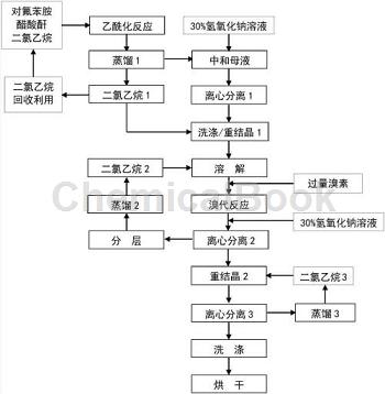 This method was first developed by Michael J.S in 1962. It uses p-fluoroacetanilide as the raw material and glacial acetic acid as the reaction solvent. The acetic acid solution of Br2 is added dropwise to the reaction system, reacted at 60°C for 1 hour, and filtered Recrystallized from ethanol aqueous solution, the yield was 94%. This method has the advantages of simple process and high yield, but because the HBr generated during the reaction cannot continue to participate in the reaction, the chlorine atom economy is poor and the wastewater treatment pressure is high.
