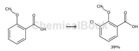 The organic layer was dried with MgSO4, filtered, and concentrated in vacuo to obtain crude benzoic acid, which was purified by chromatography or fractional crystallization. Preparation of 3-chloro-2-methoxybenzoic acid According to the above general procedure, the THF solution of recrystallized o-anisic acid (1,0.46g, 3mmol) was added dropwise to the stirring -78℃n-BuLi/t-BuOK (1:1,12mmol) solution. The solution was quenched with hexachloroethane (4.26 g, 18 mmol). Work-up in the usual way followed by chromatography (cyclohexane/ethyl acetate 80:20) gave 3-chloro-2-methoxybenzoic acid (0.218 g, 39%) as a yellow solid: mp 114- 116℃. 1H NMR (200MHz, CDCl3) δppm: 4.06 (s, 3H), 7.21 (t, 1H, J = 8.0Hz), 7.62 (dd, 1H, J = 8.0Hz, J = 1.6Hz), 7.99 (dd), 1H, J = 8.0Hz, J = 1.6Hz). 13CNMR (100MHz, CDCl3) δppm: 62.5, 124.6, 125.3, 129.0, 131.2, 135.7, 155.9, 167.6. IR (pure): 2826,2558,1667,1586,1463,1234,1076,917cm-1. HRMS (EI) m/z calculated value. C8H7O3Cl (M + .bul): 186.0083. Actual measurement: 186.0079.