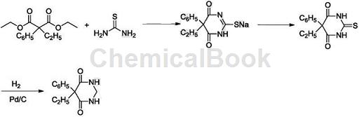 The specific steps of the preparation method are as follows: (1) using diethyl phenylethyl malonate and thiourea as raw materials, synthesizing sodium thiophenobarbital through condensation; (2) thiophenobarbital Thiophenbarbital is synthesized by acidification with sodium thiol; (3) thiophenobarbital is subjected to high-pressure hydrogenation and reduction using low-carbon alcohol as the solvent and palladium carbon as the catalyst to obtain primidone; its preparation route is as follows:The advantage of the present invention is that on the basis of the original process, the synthesis process is optimized to avoid the need to use a large amount of acid in the reduction process, thereby avoiding environmental pollution.