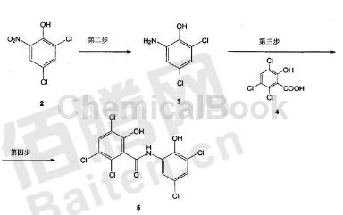 Step 2: Put 380g of chlorobenzene, 36.6g (0.152mol) of 3,5,6-trichlorosalicylic acid and the above-mentioned 2-amino-4,6-dichloro into a dry 500ml four-necked flask. Phenol (compound 3) 26.7g (0.15mol), start stirring, heat to reflux until the material is completely dissolved, slowly add 18.9g thionyl chloride (0.159mol) dropwise under reflux for about 3 hours, the tail gas generated in the process is Absorb liquid caustic soda; after dropping, continue the reflux reaction for 2 hours, slowly cool to 10°C for about 2 hours, filter with suction, wash the filter cake with 250ml of toluene, and dry at 55°C for 6 hours to obtain 58.4g of brown solid, with a yield of 97.0%, that is It is Pentachloramide (compound 5, also known as 2,3,5-trichloro-N-(3,5-dichloro-2-hydroxyphenyl)-6-hydroxybenzamide);